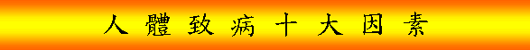 (一)父母遺傳 父母遺傳無選擇性的,醫學上以基因証實的疾病:有血友病、色盲、癲癇症,及某些代謝疾病、血液病等。例如:原發性的高血壓、憂鬱、精神病除了生理上,個性、思想觀念、行為方面也受父母遺傳影響了身體及心理的健康。 (二)自主遺傳 經科學証實能量不滅定律,您知不知道靈魂一樣不滅﹗死亡並不是結束,而是轉換到另外空間重「新」開始,面對舊有的問題,因為它都會烙在靈魂裡而遺傳下來。 自主的遺傳是非選擇性的,我們可能秉承累世以來造就的優點及缺陷,醫學上這類先天性(非父母遺傳)疾病歸因於基因的突變,明顯的疾病,例如:心臟病、殘疾、畸型兒等。就玄學的觀點,生命體的變化來自「自我累世」的生命,我們稱之為自主遺傳。 (三)居住環境 綜觀我們賴以生存的居住空間-地球,已呈每況愈下的現象!它是如何成為我們生存與健康殺手!從大的環境來看,臭氧層的破裂,工商發達、核電開發等,產生的廢物環保處理不完善,加上;現代建築材料進化,室內過度裝潢、導致過於擁擠、氣流不順暢,色彩配置導致人脾氣暴躁,或是電器、鏡子擺在北邊,導致過多磁場停滯室內,影響人體靜電之平衡狀態,或是屋樑在床的上方,或是過多的燈磁在床頭,都直接不設防睡眠中,侵襲破壞著我們健康! (四)宗教力量 「宗教」是人類社會特有的現象,由於高度智慧使得人類的生命活動,不只是在物質的領域,而擴展到精神層次,甚至玄質的探討。 由於人性中貪婪、依賴、脆弱、無知的弱點,使得本身的生物磁能變質不僅接觸不到空間中優良的宗教玄磁,反而物以類聚地招來許多不良的磁。所以我們接觸宗教要謹慎、正心,多去了解宗教的教義,避免祈求、依賴的心理,更忌隨便寄名、改運、喝符水,帶神牌等,須知正派的宗教應以提倡修行,自我提昇為正途。 (五)自然磁場與電磁波 1.自然磁場: 地球是個大自然磁場,人存活其中本身也有磁場,若懂得選擇適合人體的磁質,人們就會得到益處,例如生活舒適、健康、事業順利,心想事成等。我們發現長期睡在南北磁場線的人,會使健康走下坡,最常見病症有高血壓、偏頭痛、睡不安寧、精神衰退、心臟問題等而這些病是很難用藥物治療的。 2.電 磁 波: 長期暴露在電磁場下人體磁場的平衡會受到破壞而加速老化,患腫瘤及癌症機率會增加。 (六)運動 適度且正確的運動方式,可以促進血液循環,增強體能耐力。不當的運動會造成傷害,筋脈受損氣血的淤塞。法家氣功幫助按摩五臟六腑之外還 可促進循環代謝,使體能得到全面性的恢復。 (七)工作性質與壓力 工作性質、環境需求的不同,也伴隨著各種職業傷害,諸如外傷,容易疲倦、記憶力衰退、四肢或局部不明原因的酸疼無力。緊繃的神經如果沒有方法舒解,長期的壓抑結果,會造成神經衰弱、內分泌失調與影響心理、生理的健康。 (八)生活方式 很多人當他擁有「健康」的時候,白天工作加班,晚上應酬、玩樂。嚴重透支體能與精神,健康不久即出現問題而悔不當初,因此要養成規律的作息,不暴飲暴食的良好習慣,是我們對生命的一個長遠投資。 (九)飲食 民以食為天,飲食是營養的來源而現代環境中近來科學文明,商人大量使用賀爾蒙、抗生素以縮短飼養期,減低成本;農夫不當的使用農藥,使蔬果上殘留農藥。工業廢水污染水源,直接或間接的經由食物鏈進到我們體內,成為健康的一大隱憂。 (十)藥物 一般人常常沒有經過醫師的處方就自己到藥房購買成藥,或是購買一些來路不明的藥物、偏方,對於如何正確用藥的知識不足,或是因為本身體質對於藥物的過敏排斥,不但沒有得到健康反而身受藥物的“毒害”。 |